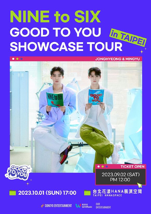 NINE to SIX(종형, 민규)는 오는 10월 1일 대만 타이베이에서 'NINE to SIX "GOOD TO YOU" SHOWCASE TOUR in TAIPEI'를 개최한다. NINE to SIX는 대만을 시작으로 쇼케이스 투어에 나설 예정인 가운데, 구체적인 투어 일정은 추후 공개된다.