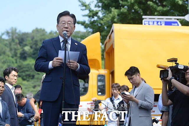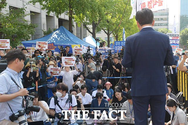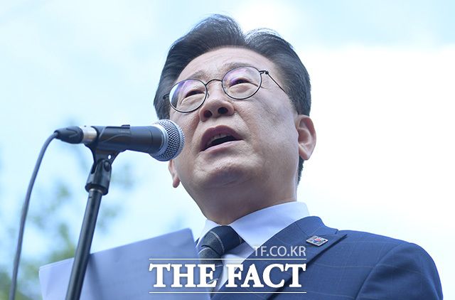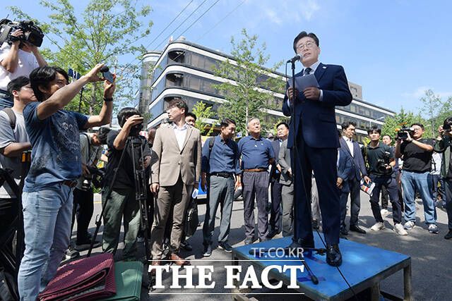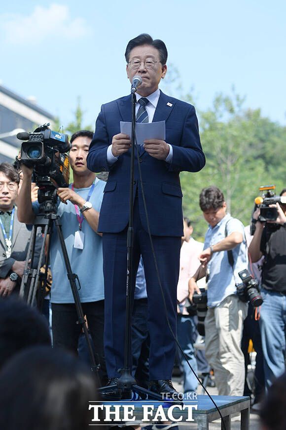 [더팩트ㅣ장윤석 인턴기자] 백현동 개발 특혜 의혹을 받고 있는 이재명 더불어민주당 대표가 17일 오전 서울 서초구 서울중앙지방검찰청 앞에서 열린 기자회견에 참석해 입장을 밝히고 있다.