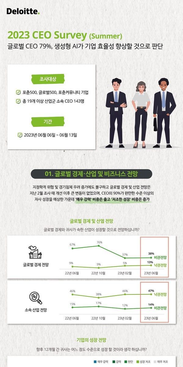 한편, ‘2023 여름 딜로이트/포춘 CEO 서베이’ 국문본 전문은 딜로이트 인사이트 앱(iOS/Android) 혹은 딜로이트 홈페이지(Link)에서 확인할 수 있다.