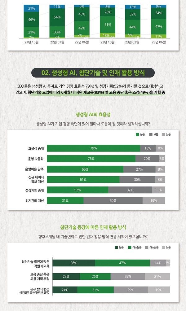 생성형 AI 도입으로 글로벌 CEO들은 기업 운영 효율성(79%), 운영 자동화(75%), 운영비용 감축(65%) 등 실질적 도움을 받을 것으로 예상했다. 이와 함께, 향후 6개월 내 첨단기술 발전에 따라 직원 재교육을 시행할 계획이라는 비중은 83%로 나타났다. 다만, 원격 및 하이브리드로 근무 방식 변경 52%, 고용 중단 혹은 고용 계획 조정 응답 비중도 49%에 달했다.
