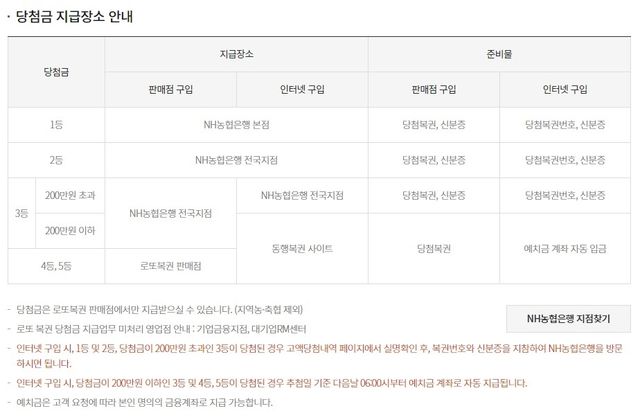 그러나 3등부터는 은행을 방문해야 당첨금 수령이 가능하다. 당첨된 복권 용지와 함께 신분증도 꼭 지참해야 한다. 2·3등은 NH농협은행 전국지점, 1등은 NH농협은행 본점에서 당첨금을 지급한다.