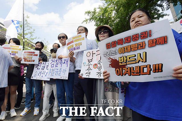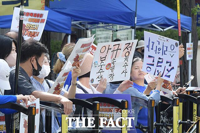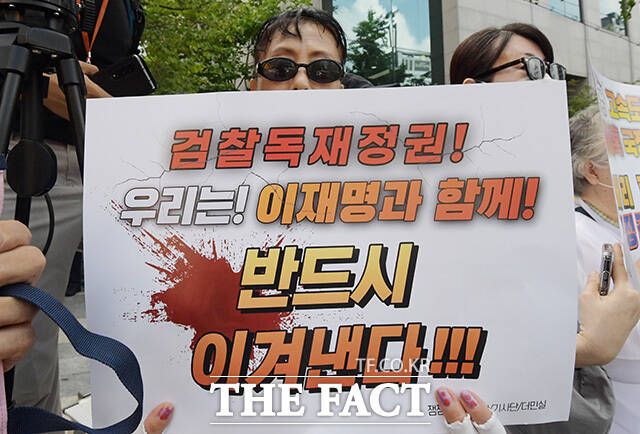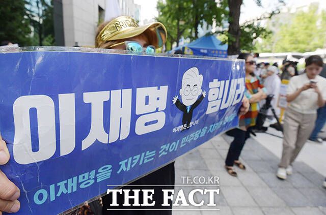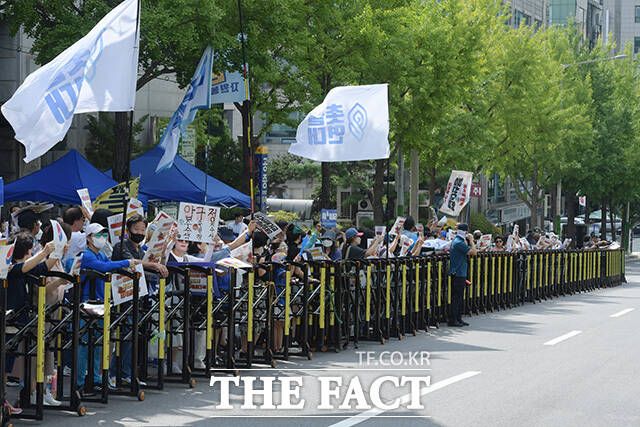 [더팩트ㅣ장윤석 인턴기자] 백현동 개발 특혜 의혹을 받고 있는 이재명 더불어민주당 대표가 17일 오전 서울 서초구 서울중앙지방검찰청에 출석을 앞둔 가운데 지지자들이 이재명 대표 응원 집회를 하고 있다.