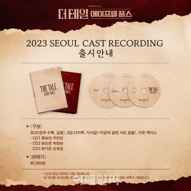 2023년 재연으로 돌아온 ‘더 테일 에이프릴 풀스’는 지난 7월 OST 깜짝 발매 소식으로 관객들의 뜨거운 반응을 얻었다. 이번 OST는 공연 실황으로 구성했다. 3CD에 각 페어별 전곡을 수록했고, 미공개 공연사진이 들어간 가사집도 포함됐다.