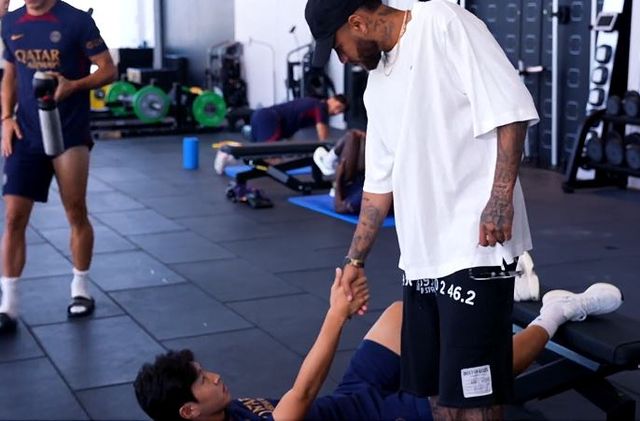 이강인의 모습도 있었다. 네이마르는 누워서 스트레칭을 하던 이강인에게 다가가 악수를 청했고, 이강인도 기다렸다는 듯 손을 맞잡으며 짧은 시간이었지만 가장 절친하게 지냈던 네이마르를 떠나보냈다.