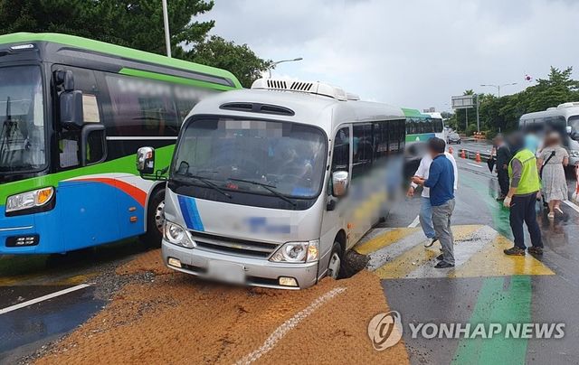 18일 오전 제주국제공항 입구 교차로에 발생한 포트홀에 렌터카 셔틀버스가 빠지는 사고가 발생했다. 사고 현장이 담긴 사진 / 연합뉴스-제주도 자치경찰단 제공