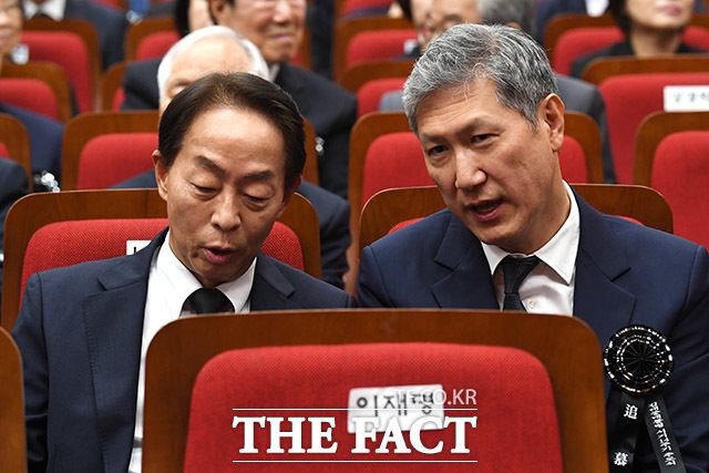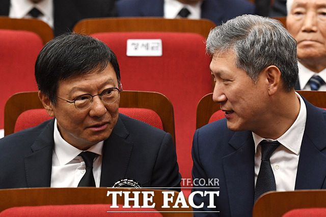 대화 나누는 김홍업 김대중평화센터 이사장(김대중 전 대통령 아들)과 박지만 EG 대표이사(박정희 전 대통령 아들).
