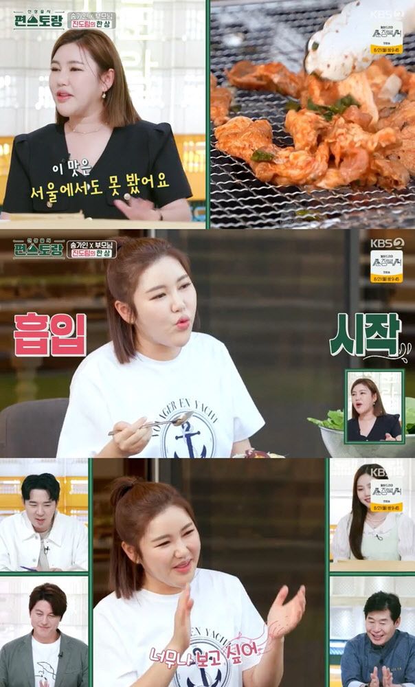 이날 송가인은 깜짝 출연한 부모님의 모습에 함박웃음을 지으며 이목을 끌었다. 송가인은 “엄마 아빠가 너무 신경을 많이 써주셨다”라며 부모님이 ‘편스토랑’ 출연을 위해 지원사격에 나선 점을 어필했다.