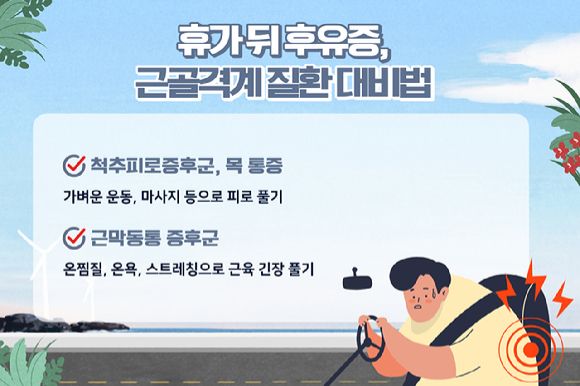 [아이뉴스24 정종오 기자] 여름휴가를 마치고 후유증으로 목과 허리 등이 뻐근하고 아프다고 하는 사람이 있다. 오랫동안 운전 하거나 비행기에 앉아 있는 경우 피로가 누적돼 근육통이나 피로 증후군 등을 호소하는 경우에 해당된다.