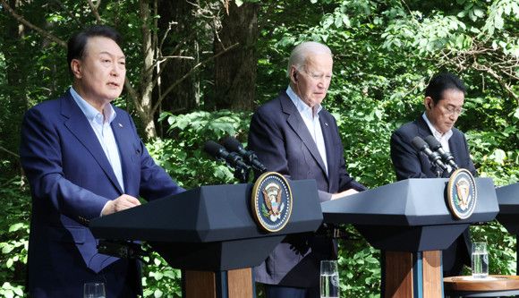 한편 한미일 정상회의에서 한미일 간 포괄적 협력 방안을 망라해 정상 공동성명으로 채택한 '캠프 데이비드 정신'과 향후 한미일 협력을 추진하는 과정에서 견지해 나가야 할 원칙들을 문서화해 합의한 '캠프 데이비드 원칙'을 채택했다.