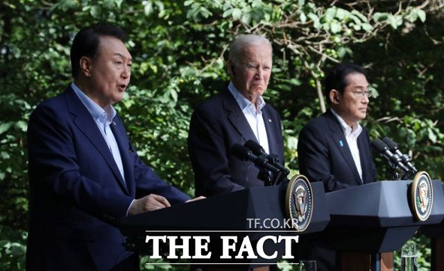 윤석열 대통령이 18일(현지시간) 메릴랜드주에 위치한 미국 대통령 별장 캠프 데이비드에서 조 바이든 미국 대통령, 기시다 후미오 일본 총리와 공동기자회견을 하고 있다. /캠프 데이비드=뉴시스