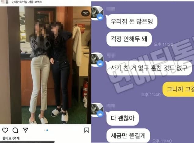 여기에는 한 여성이 명품 향수와 고가 화장품이 놓인 화장대에서 휴대전화를 들고 있는 모습과 인터컨티넨탈 서울 코엑스 호텔에서 친구와 호캉스를 즐기는 모습이 담겼습니다.