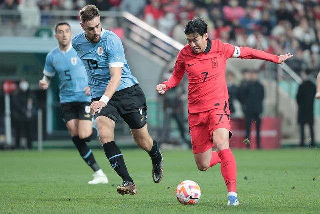 손흥민이 지난 3월 28일 서울월드컵경기장에서 열린 한국과 우루과이와의 평가전에서 드리블하고 있다.