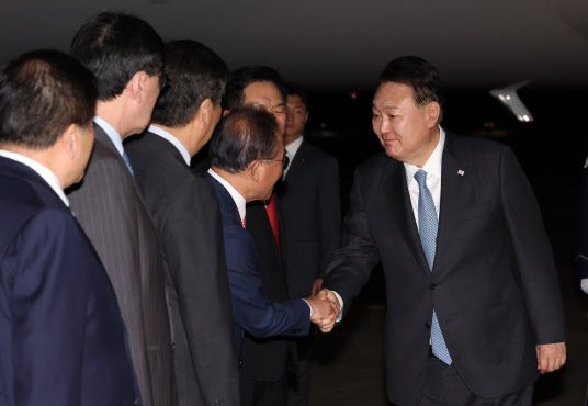 윤 대통령은 이날 새벽 대통령 전용기인 공군 1호기 편으로 경기도 성남 서울공항에 도착했다.