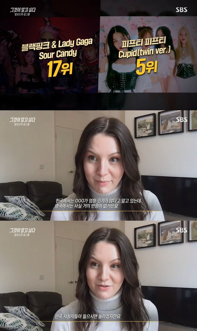 영국의 K팝 팬과의 인터뷰를 진행한 뒤에는 'Cupid'가 영국 오피셜 차트에서 최고 순위 5위를 차지했다는 소식을 전했는데, 이와 함께 레이디 가가와 협업한 블랙핑크(BLACKPINK)의 'Sour Candy'가 이전에 17위를 기록했던 것을 강조했다.