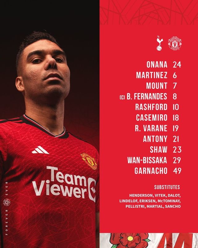 이에 맞서는 맨유도 4-2-3-1 포메이션을 내세웠다. 마커스 래쉬포드가 원톱에 섰고 그 뒤를 알레한드로 가르나초, 브루노 페르난데스, 안토니가 받쳤다. 메이슨 마운트, 카세미루가 3선에 자리했으며 루크 쇼, 리산드로 마르티네스, 라파엘 바란, 아론 완비사카가 수비진을 구성했다. 골문은 안드레 오나나가 방어했다.