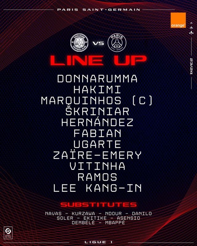 원정팀 PSG는 4-3-3 포메이션을 내세웠다. 이강인, 곤살루 하무스, 비티냐가 공격진에 이름을 올렸고 파비안 루이스, 마누엘 우가르테, 워렌 자이르에머리가 중원을 지켰다. 뤼카 에르난데스, 밀란 슈크리니아르, 마르퀴뇨스, 아치라프 하키미가 수비진에 섰으며 잔루이지 돈나룸마가 골문을 지켰다.