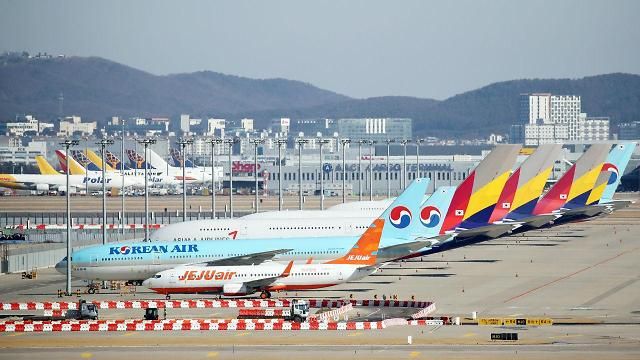 停泊在仁川机场的大韩航空与韩亚航空客机【图片来源 韩联社】