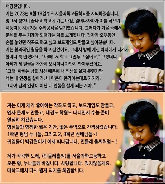 이후 지난 19일 자신의 유튜브 채널을 통해 서울과학고등학교 자퇴 소식을 알린 백강현은 "저는 2023년 8월 18일부로 서울과학고등학교를 자퇴했다"며 "엊그제 방학이 끝나고 학교에 가는 아침, 이를 닦으며 허둥지둥 수학공식을 암기했다. 그러다 거울 속에서 문제를 푸는 기계가 되어가는 저를 보게된다. 갑자기 오랫동안 손을 놓았던 작곡도 하고 싶고 보드게임도 만들고 싶어졌다. 저는 창의적인 활동을 하고 싶었다"고 적었다.