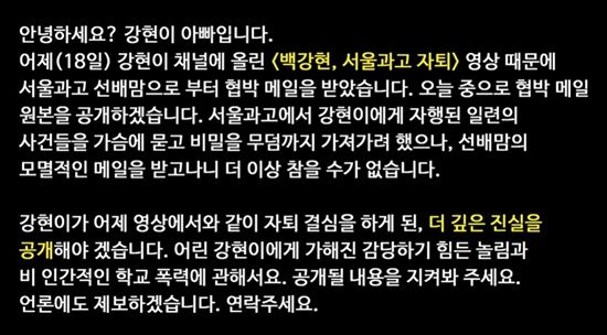 백강현의 아버지는 "안녕하세요. 강현이 아빠입니다. 18일 강현이 채널에 올린 '백강현, 서울과고 자퇴' 영상 때문에 서울과고 선배맘으로부터 협박 메일을 받았다"라고 전했다.