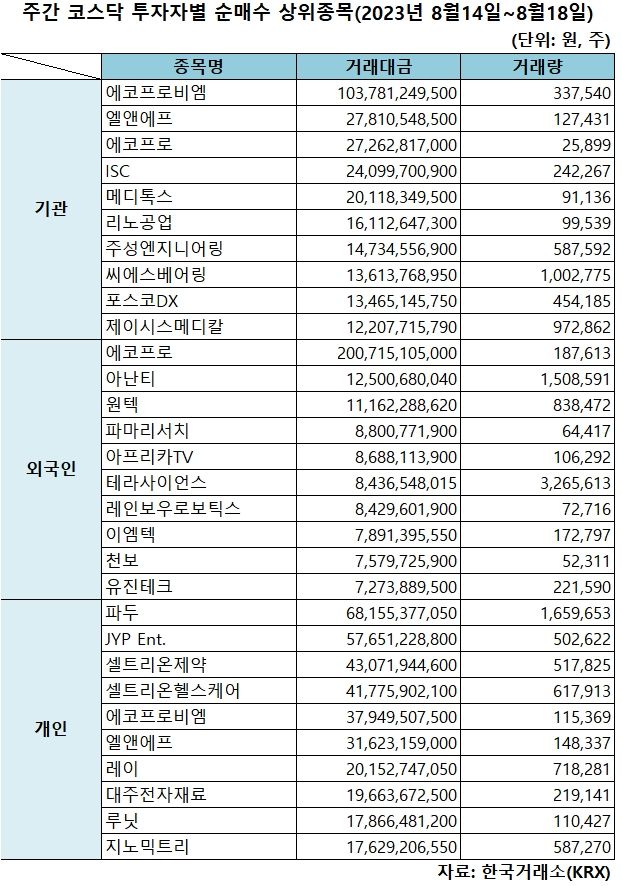 기관 '에코프로비엠'·외인 '에코프로'·개인 '파두' 1위 [주간 코스닥 순매수- 8월14일~8월18일]
