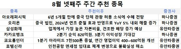 [아이뉴스24 김지영 기자] 중국 단체 관광객 허용 소식에 아모레퍼시픽, 호텔신라 등이 수혜를 입을 것으로 전망된다. 이를 비롯해 전문가들은 2분기 호실적을 기록한 카카오뱅크, 새 회계제도 적용으로 견조한 배당 증가가 기대되는 삼성화재 등을 관심 종목으로 지목했다.