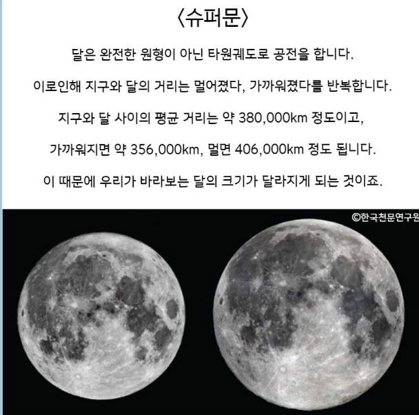달은 완전한 원형이 아닌 타원궤도로 공전을 하기 때문에 지구와 달의 거리가 멀어졌다, 가까워졌다 합니다. 통상 달이 36만㎞ 이내로 가까워지면 슈퍼문이라고 부르는데, 슈퍼문은 평균적인 보름달보다 최대 7% 정도 크게 보입니다. 지구와 가장 멀리 떨어져 있을 때보다는 최대 14% 크고, 30% 밝게 보이죠.