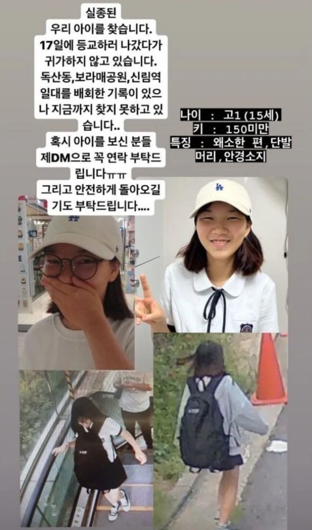 부모가 공개한 SNS 게시글에는 "실종된 우리 아이를 찾는다"며 "17일에 등교하러 나갔다가 귀가하지 않고 있다. 독산동, 보라매공원, 신림역 일대를 배회한 기록이 있으나 지금까지 찾지 못하고 있다"고 호소했다.