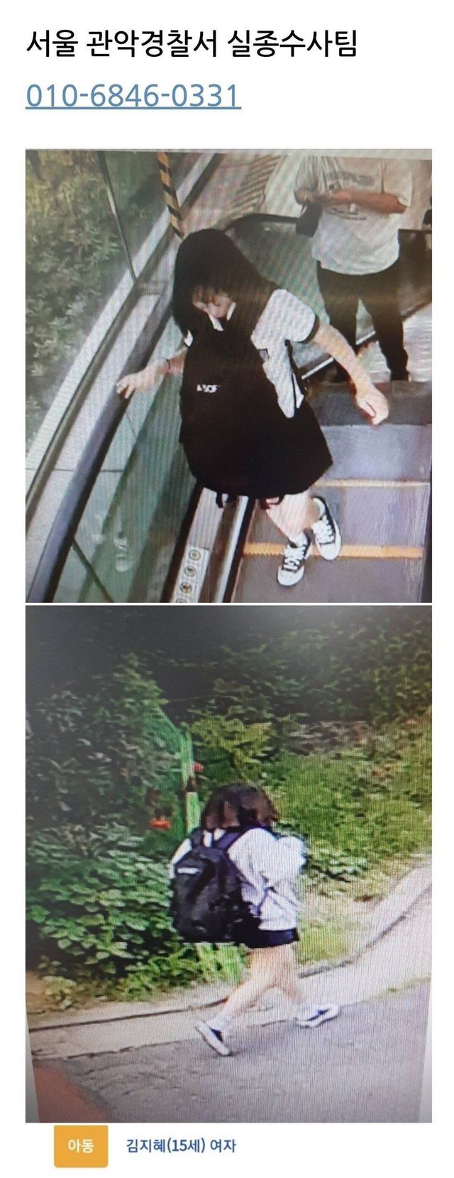 게시글에는 서울 관악경찰서 실종수사팀 연락처와 함께 김 양의 마지막 행적이 담긴 CCTV 사진이 추가됐다. CCTV 사진 속 김 양은 교복을 입고 책가방을 멘 상태였으며 지하철역으로 추정되는 에스컬레이터를 이용하기도 했다.