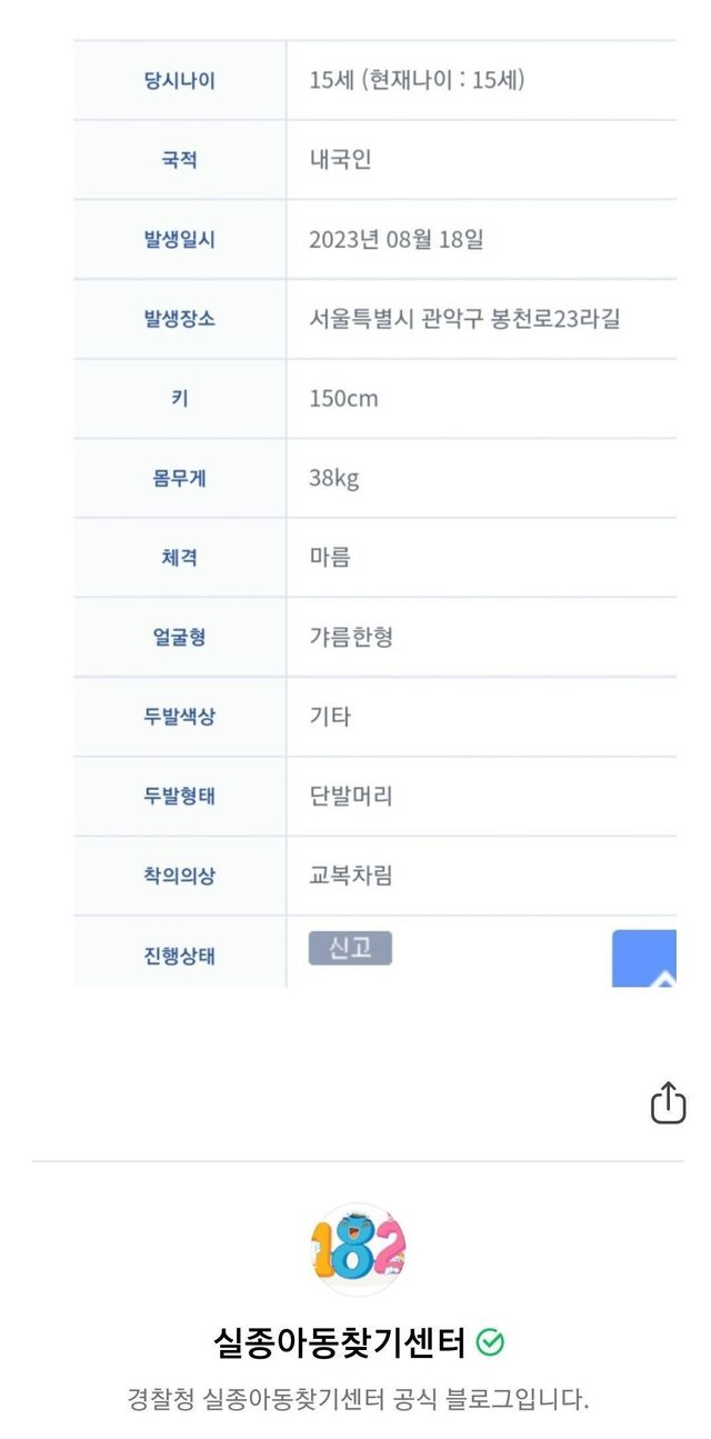 경찰청 실종아동찾기센터에 게재된 게시글 / 이하 네이버 블로그