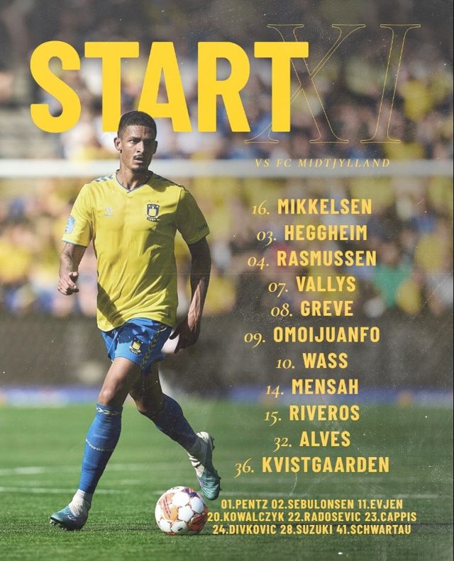 브뢴비는 3-4-1-2 전형으로 맞섰다. 토마스 미켈센이 골문을 지켰고, 야콥 라스무센, 프레데릭 알베스, 헨리크 헤게임이 백3를 구성했다. 3선엔 블라스 리베로스, 다니엘 바스, 마티아스 그레베, 케빈 멘사가 배치됐고, 2선에 니콜라이 볼리스가 출격. 최전방에서 오히 오모이주안포와 마티아스 크비스트고르덴이 미트윌란 골문을 노렸다.
