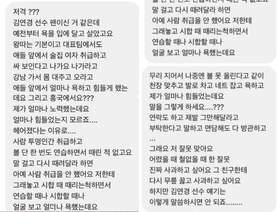 그러면서 "합 때는 (자신이 토스한 공을) 때리는 척하면서, 연습할 때나 시합할 때는 얼굴 보고 욕을 했다"며 "무리 지어서 나중엔 볼 못 올린다고 같이 천장 맞추고 발로 차고 네트 잡고 욕하고 너무 힘들었는데, 말을 그렇게 하시냐"고 토로했다.
