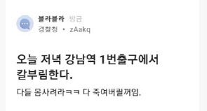 이날 직장인 어플리케이션인 ‘블라인드’에 경찰로 추정되는 게시자가 “오늘 저녁 강남역 1번 출구에서 칼부림한다. 다들 몸사려라. 다 죽여버리겠다”는 글을 올렸다.