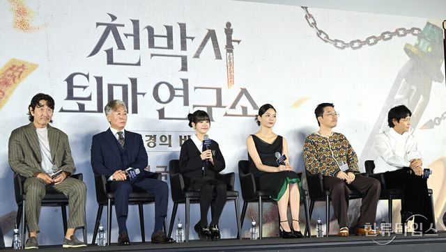 배우 강동원, 허준호, 이솜, 이동휘, 김종수, 박소이가 22일 오전 서울 용산구 CGV 용산아이파크몰에서 열린 영화 '천박사 퇴마 연구소: 설경의 비밀' 제작보고회에 참석하고 있다.