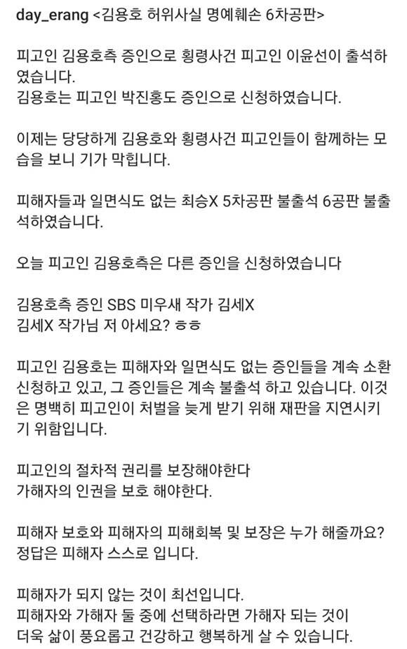 이어 "피해자들과 일면식도 없는 최모씨는 5차와 6차 공판에 불출석했다. 21일 김용호는 SBS '미우새' 작가 김모씨를 증인으로 신청했다. 작가님, 저 아세요?"라고 분노했다.