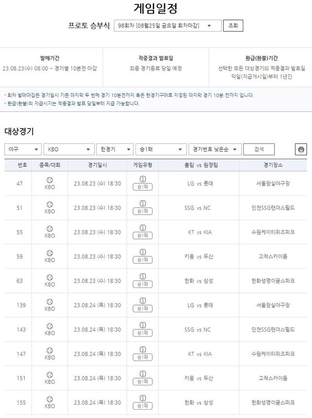 이어 프로토 승부식 98회차에선 23일(수) 경기인 LG-롯데(47번), SSG-NC(51번), KT-KIA(55번), 키움-두산(59번), 한화-삼성(63번)전과 24일(목) 경기인 LG-롯데(139번), SSG-NC(143번), KT-KIA(147번), 키움-두산(151번), 한화-삼성(155번)전으로 참여가 가능하다.