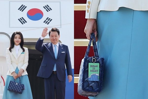 ▲ 윤석열 대통령과 함께 프랑스를 방문한 김건희 여사가 지난 6월 19일(현지시각) 파리 오를리 공항에서 2030부산엑스포 유치를 홍보하는 '부산은 준비됐다(BUSAN IS READY)'와 '힙 코리아(HIP KOREA)' 키링이 달린 손가방을 들고 걷고 있다. ⓒ연합뉴스