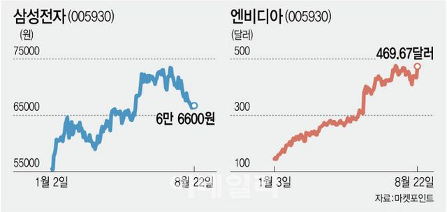 하지만 시장에서는 삼성전자와 SK하이닉스의 재평가가 이뤄질 것으로 기대하고 있다. 계기는 AI반도체 붐을 이끈 ‘엔비디아’의 2분기 실적이다. 엔비디아는 오는 23일 장 마감 후 회계연도 2분기(5~7월) 실적을 발표하는데, 시장은 올해 2분기 매출이 지난해 같은 기간보다 65% 이상 증가했을 것으로 보고 있다. 이에 엔비디아는 21일 뉴욕증시에서 무려 8.47% 급등한 469.67달러(62만9970원)에 거래를 마쳤다.