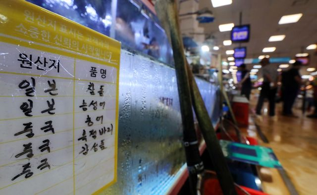 일본 정부가 후쿠시마 제1원전 방사성 오염수 방류를 결정한 지난 22일 오전 서울 동작구 노량진수산시장 한 상가에 원산지가 표시되어 있다.