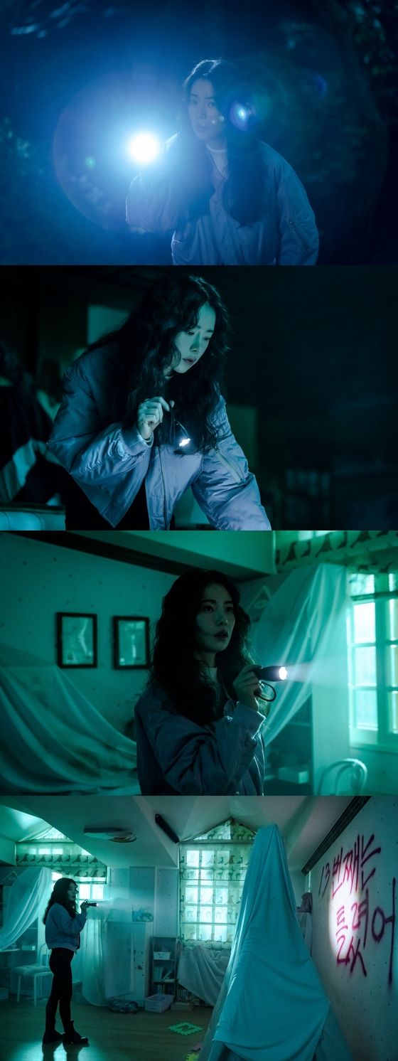 사진 속 주현은 늦은 밤 손전등 불빛에만 의지한 채 홀로 어딘가를 찾은 모습이다.다음 사진에서는 실내에 들어선 듯한 주현이 날카로운 눈빛으로 이곳저곳을 살피고 있다.주변도 분간할 수 없을 만큼 컴컴한 상황,희미한 손전등 불빛,금방이라도 누군가 튀어나올 수도 있다는 불안감 등이 일촉즉발 긴장감을 유발한다.
