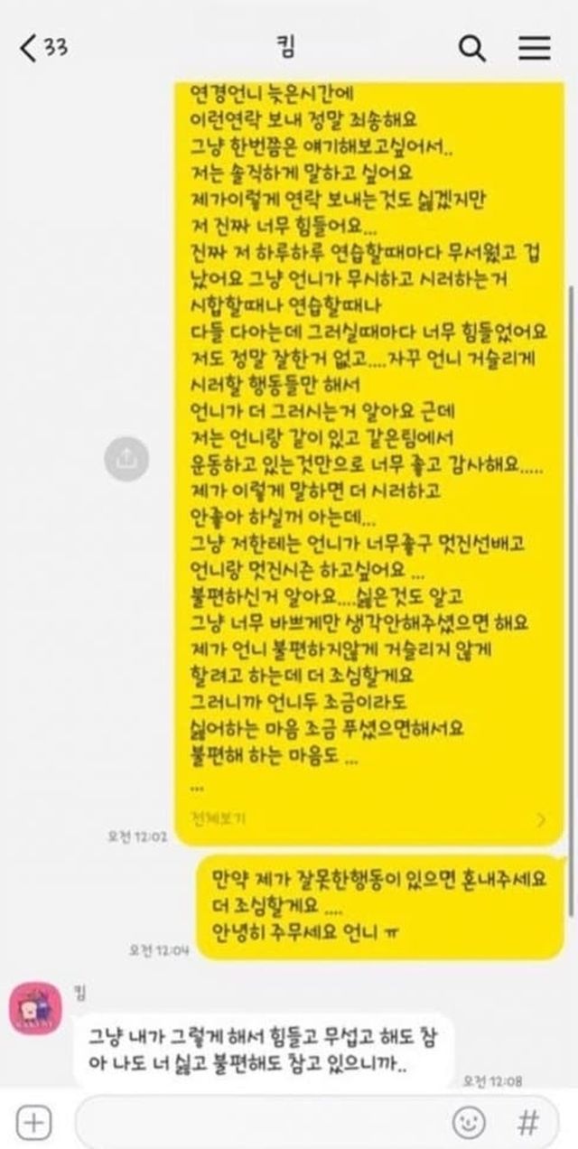 이에 김연경은 "그냥 내가 그렇게 해서 힘들고 무섭고 해도 참아. 나도 너 싫고 불편해도 참고 있으니까…"라고 답했다.