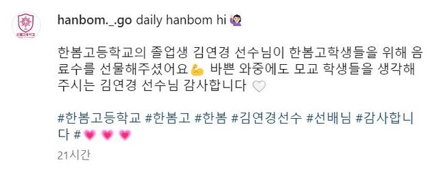 지난 22일 김연경 선수가 졸업한 한봄고등학교 공식 SNS에는 음료수 사진이 게재됐다. 학교 측은 “한봄고등학교 졸업생 김연경 선수가 학생들을 위해 음료수를 선물해줬다”며 “바쁜 와중에도 모교 학생들을 생각해 주시는 김연경 선수 감사하다”는 글을 남겼다.