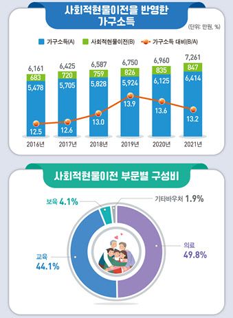 전체 가구 평균소득 대비 사회적 현물이전 소득 비중은 13.2%로 집계됐다. 정부가 가구 소득의 13% 가량을 대신 지출해주는 효과가 있었다는 의미다.