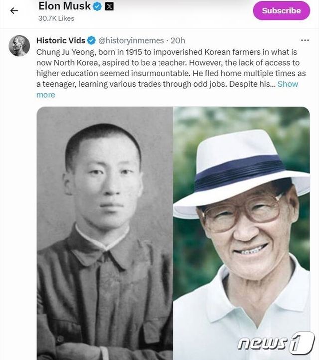 16일(현지 시각) 머스크는 엑스(X·옛 트위터)를 통해 한 해외 누리꾼이 올린 정 명예회장 일대기 관련 게시물에 '좋아요'를 눌렀다. 해당 게시물에는 정 명예회장의 파란만장한 일대기가 담겼다.