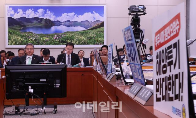 이날 외통위 전체회의는 당초 예정보다 1시간가량 늦어진 오전 11시께 시작됐다. 민주당 소속 외통위원이 자신들의 자리에 ‘후쿠시마 원전 오염수 해양투기 반대한다’ ‘모두의 바다 우리가 지킵시다’ 등이 쓰인 피켓을 두면서다.