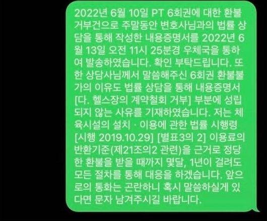 이를 근거로 A씨는 헬스장에 '15일 이내에 29만7000원을 환불하지 않으면 전자 소송을 내겠다. 소송 비용도 청구하겠다'고 으름장을 놨다. 또한 '이번 사태로 정신과 치료를 받고 있으니 따로 민사소송도 걸겠다'고 통보했다.