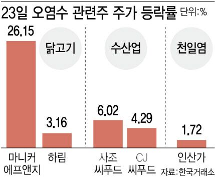 정부가 안전을 강조했지만, 후쿠시마 관련주는 불안 심리를 반영해 출렁였다. 소비자들이 수산물보다는 닭고기 소비를 늘릴 것이란 관측에 닭고기 관련주가 급등했다. 오염수가 방류되면 어묵, 맛살, 통조림 건어류 등 대체재인 수산물 가공식품을 찾을 것이란 전망에 수산물 관련주도 오름세다. 품귀 현상이 빚어졌던 천일염 관련한 종목의 주가도 여전히 들썩였다.