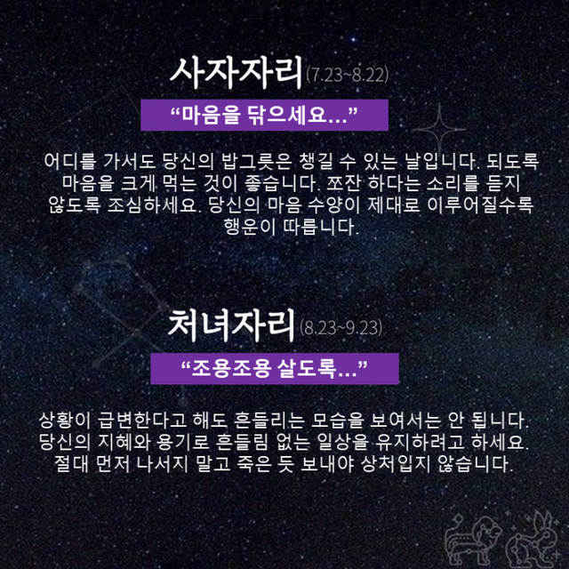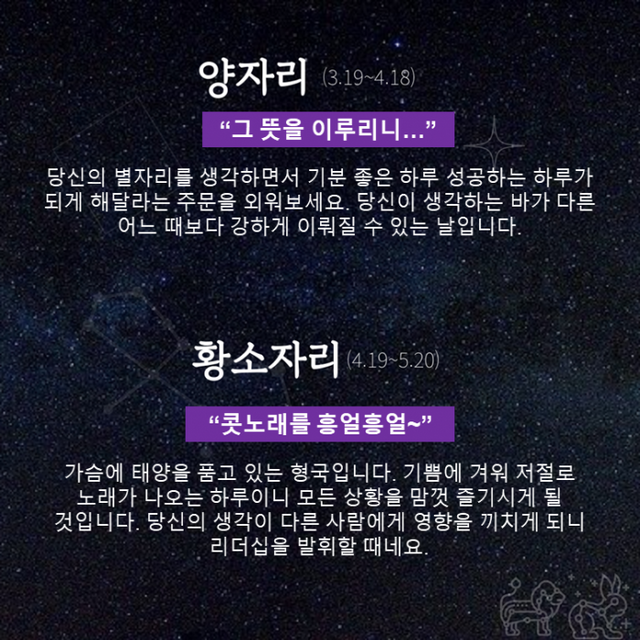 당신의 별자리를 생각하면서 기분 좋은 하루 성공하는 하루가 되게 해달라는 주문을 외워보세요. 당신이 생각하는 바가 다른 어느 때보다 강하게 이뤄질 수 있는 날입니다.