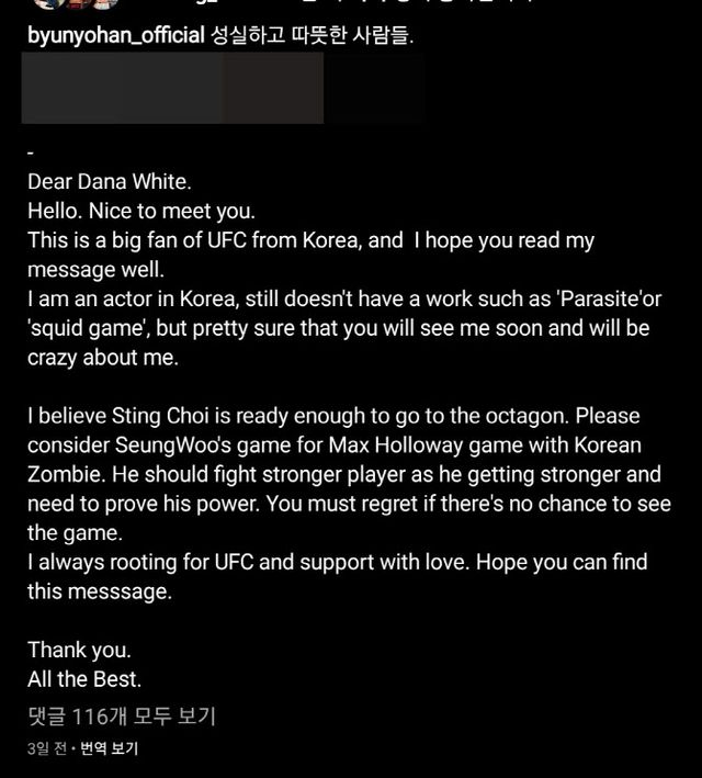 배우 변요한이 데이나 화이트 UFC 대표에게 보낸 메일. 사진=변요한 SNS