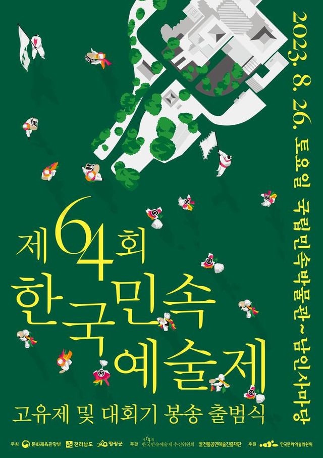 문화체육관광부(장관 박보균), 전라남도(도지사 김영록), 영광군(군수 강종만)이 주최하고 전통공연예술진흥재단(이사장 김삼진), 한국민속예술제 추진위원회(위원장 강등학), 국립민속박물관(관장 김종대)이 주관하는 제64회 한국민속예술제의 ‘고유제 및 대회기 봉송 출범식’이 8월 26일(토) 오전 11시 국립민속박물관에서 열린다.