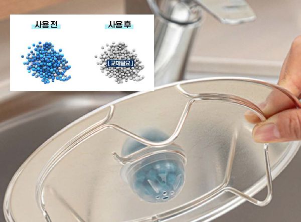 포함된 캡슐클리너는 간단하게 배수구 커버 밑에 부착해 주면 된다. 세정, 탈취, 항균 효과가 있는 제품으로 테스트 결과 배수구 주요 악취균이 감소하는 효과를 인증했다. 캡슐 1개당 약 1개월 동안 사용할 수 있으며 캡슐 속 블루볼 색상이 모두 빠지면 새로운 캡슐로 교체해 주면 된다.